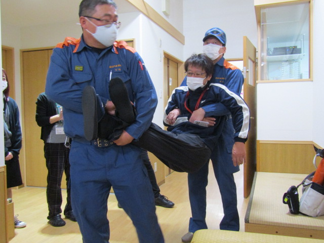 当日は消防署の職員の方にお越しいただき、非常階段を使う際に折りたたみタンカや椅子・毛布などを使った安全な避難方法について実際に指導を受けました。