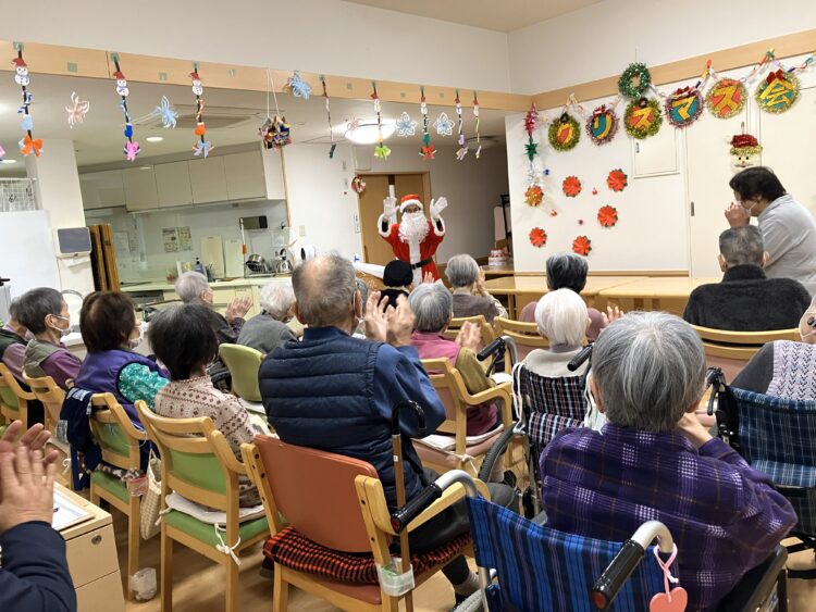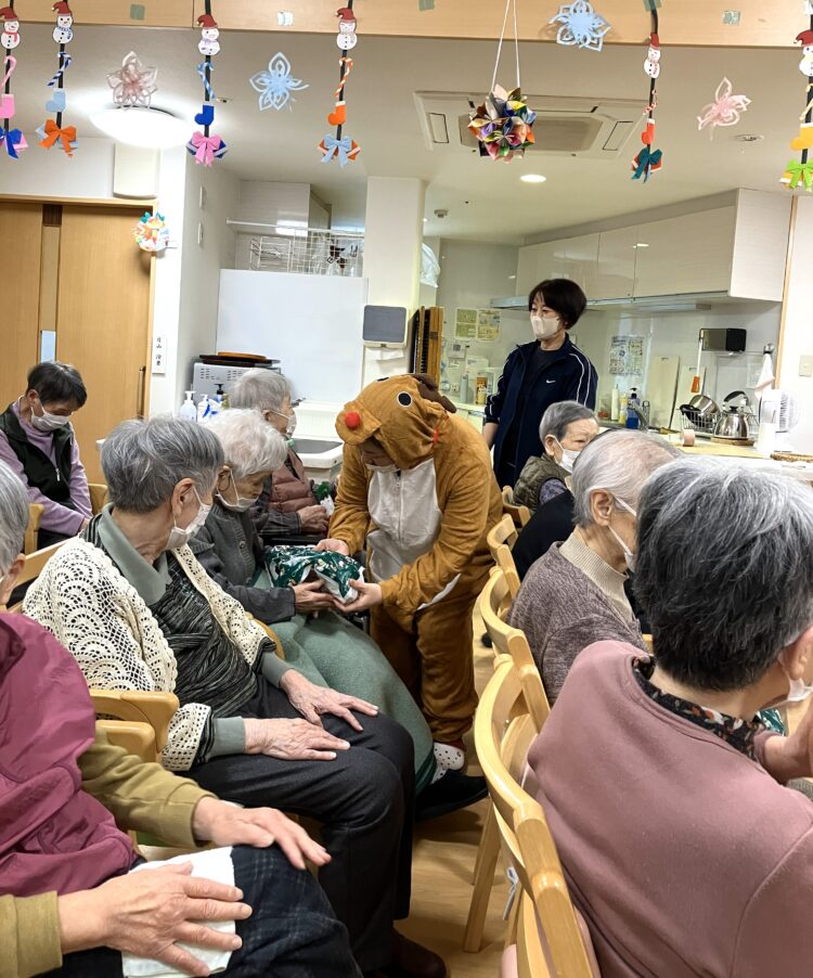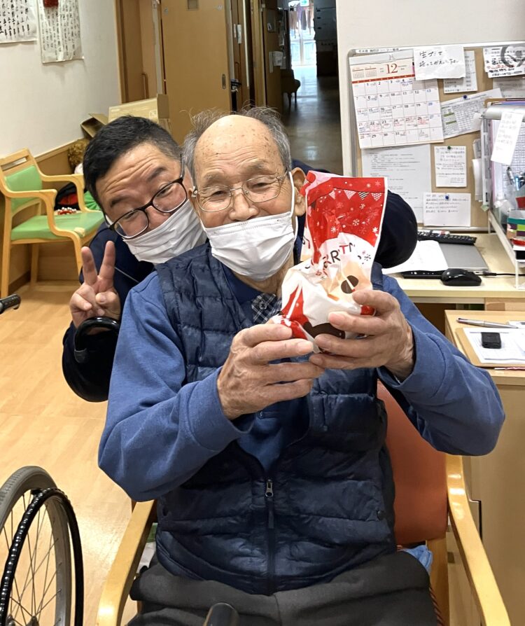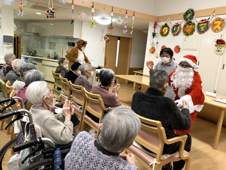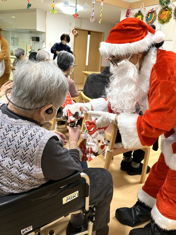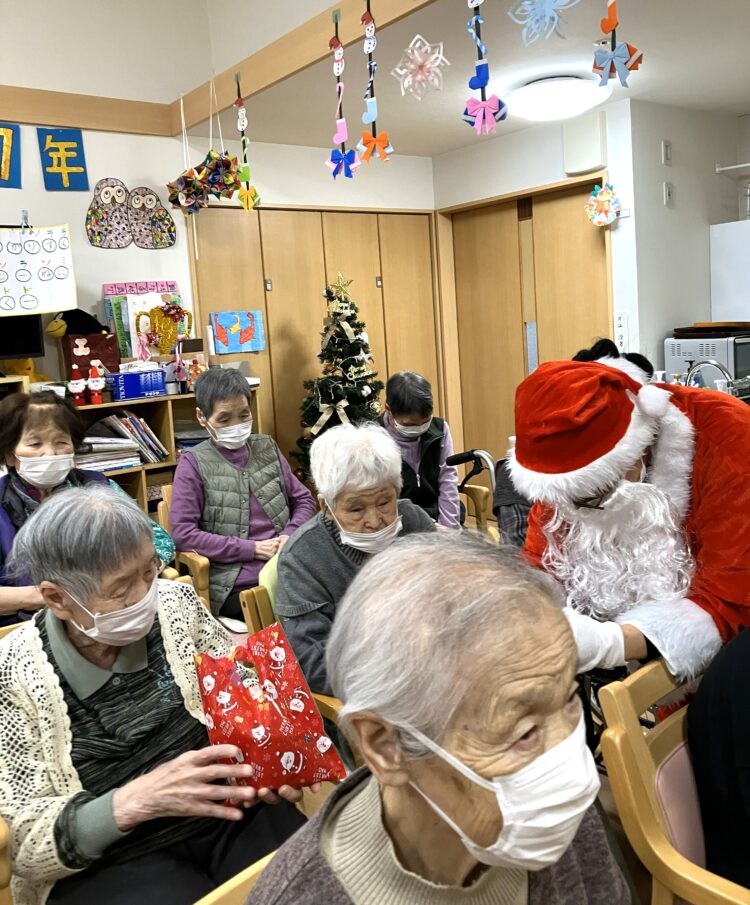 しばらくすると遠くから鈴の音が聞こえサンタクロース🎅とトナカイ🦌がやってき大きな袋にプレゼント🎁を持って来てくれました。利用者一人ひとりにプレゼントが届き皆さん喜んでおられました😍