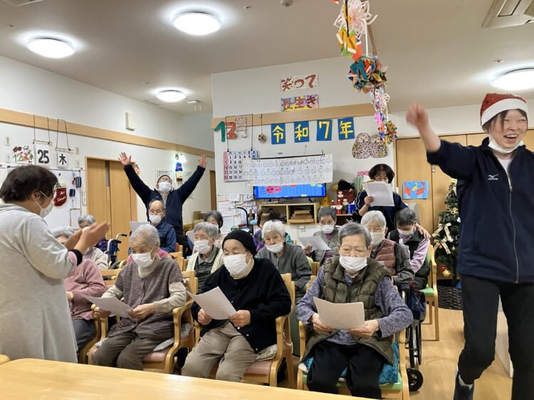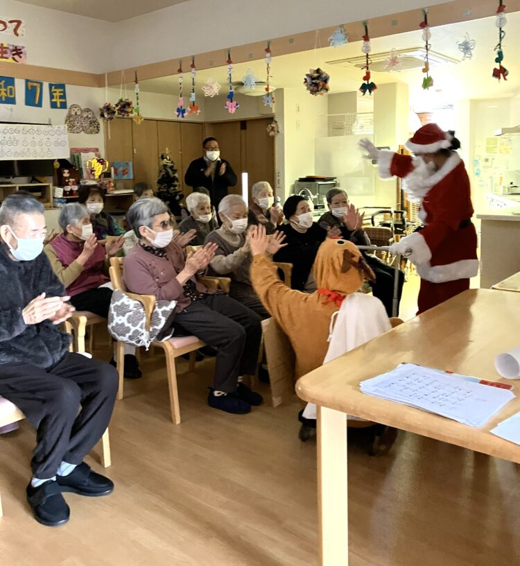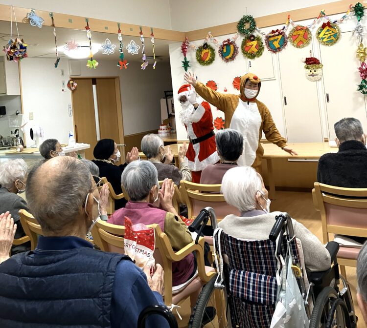 始めに職員によるハンドベルの演奏、「きよしこの夜」「きらきら星」、その後に利用者、職員の皆で「赤鼻のトナカイ」「雪がこんこん」を合唱しました🎵🎵