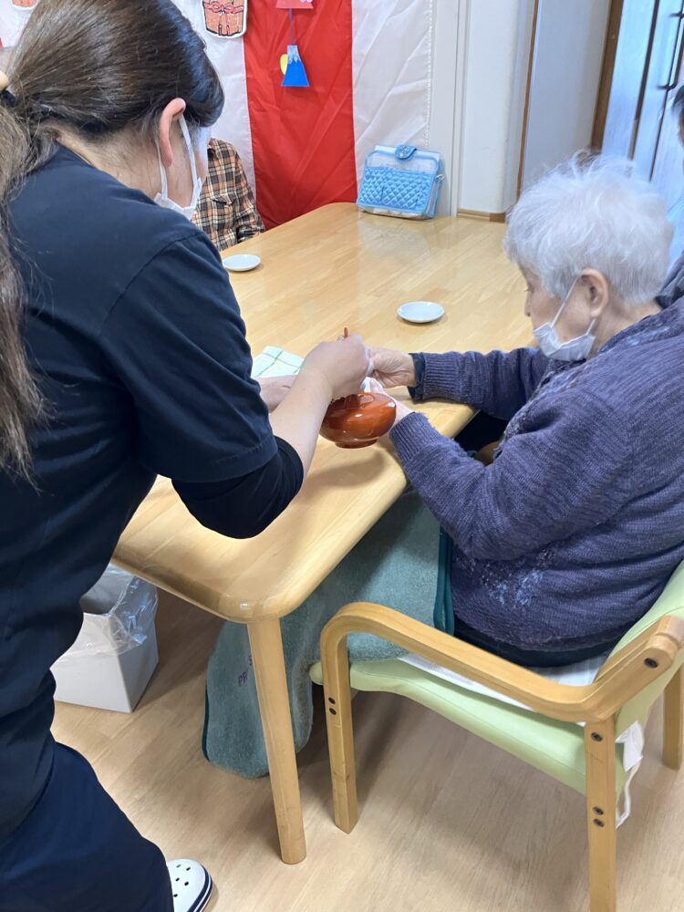 二人羽織では「あーもうちょっと上や、そこそこ、いまやー」とご利用者の声のヒント!でプリンをパクっと。最後はお皿ごと飲むように食べていました🤣🤣