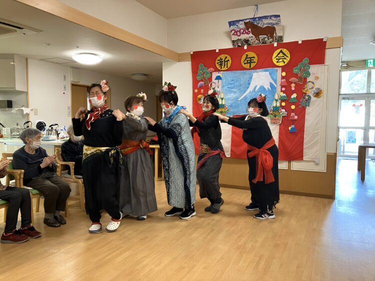 午後からの余興では羽子板、二人羽織、ダンスを披露👗