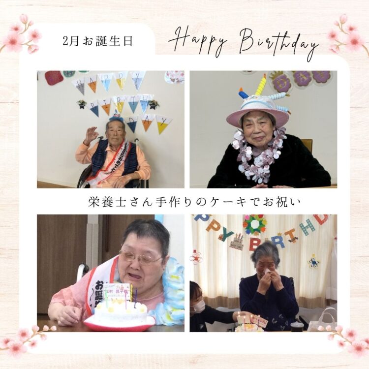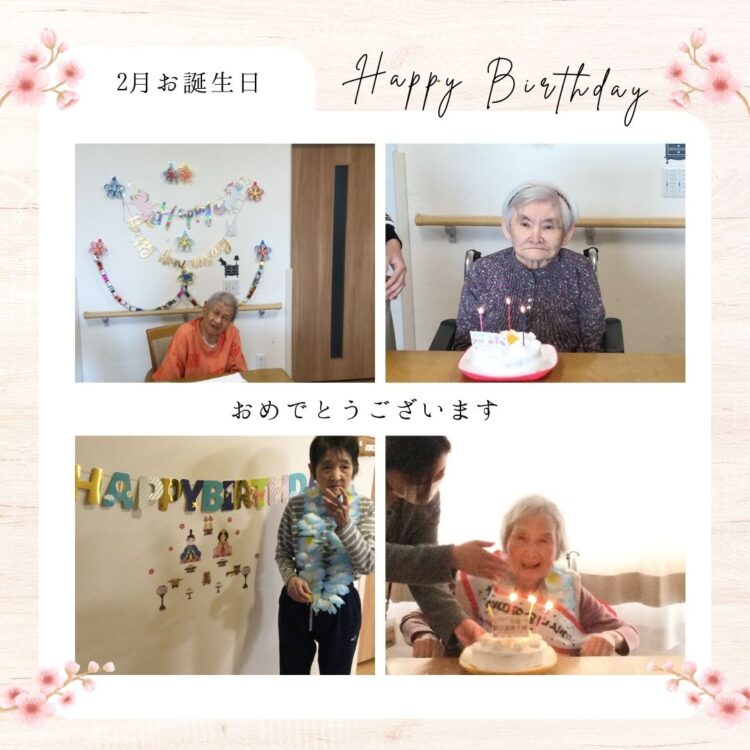 神戸 神戸 2026.03.09 🎂2月お誕生日のご利用者様🎂 お誕生日おめでとうございます😊 神戸まどか園では当日に手作りケーキでお祝いさせていただきます。 皆様『ありがとう ありがとう』と おしゃってくれます。 一緒に楽しい1年を過ごさせてくださいね😊