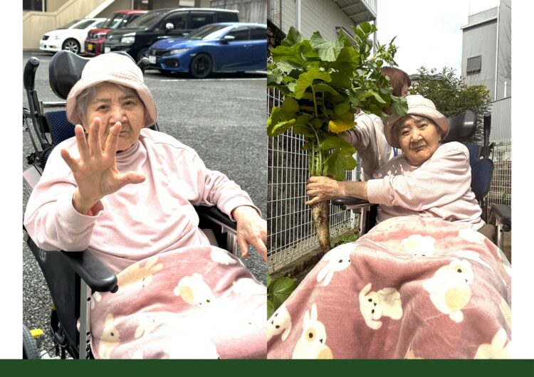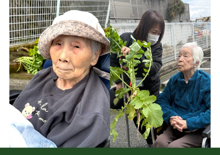 立派な葉っぱに比べて少し小ぶりな大根が多めでしたが、それでもしっかりと土に埋まっている大根を抜くのは少し力がいり、「うーんうーん」「よいしょよいしょ」と言いながらご利用者様に収穫していただきました。