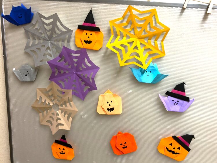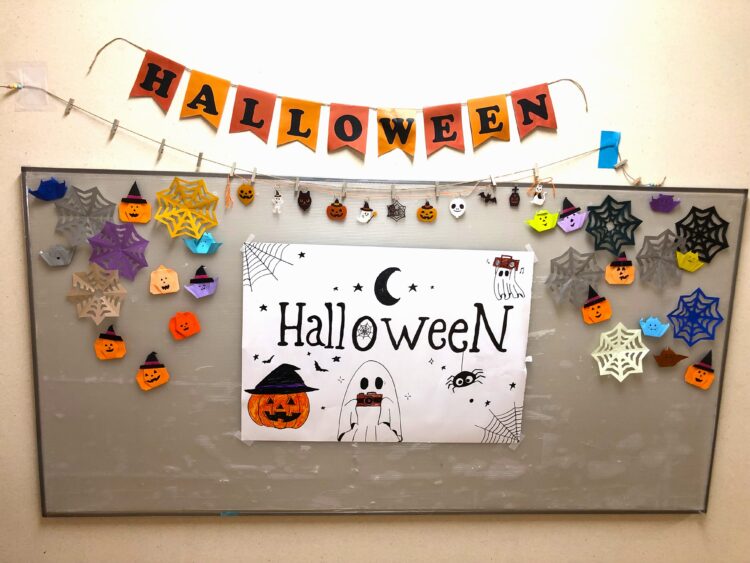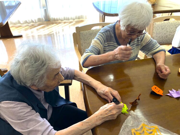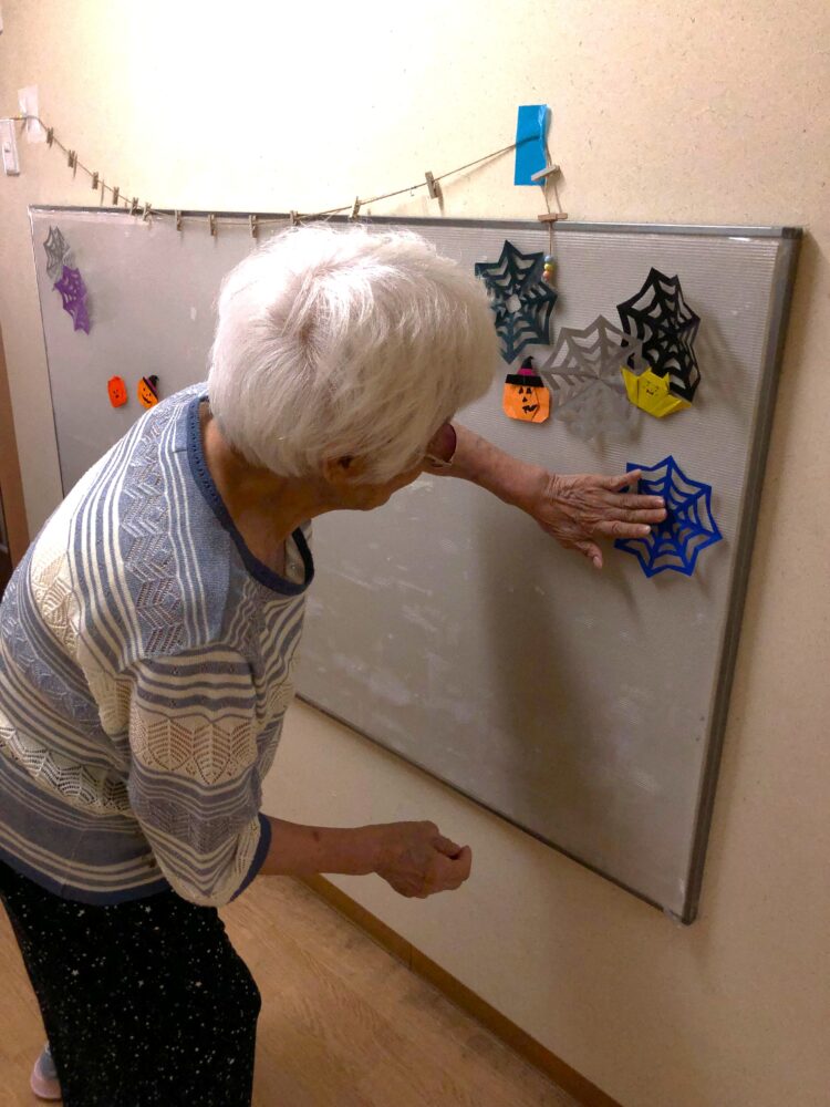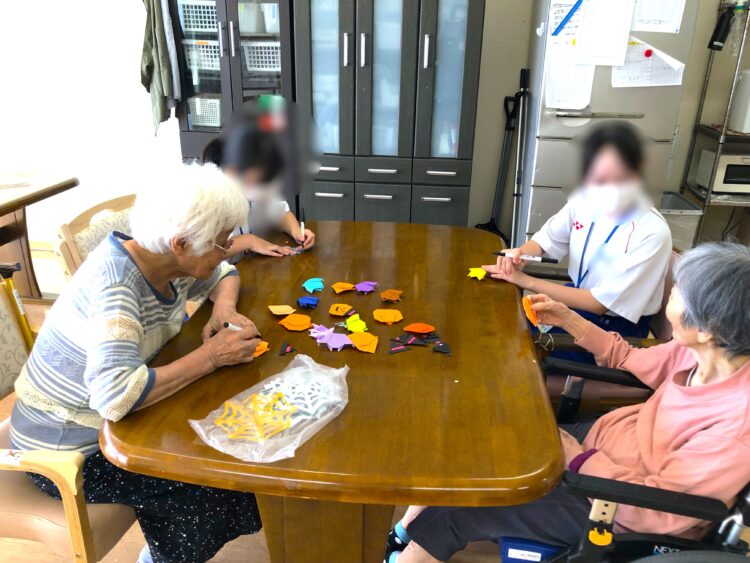 ハロウィンの飾りづくりのレクリエーションを一緒に行い、可愛い壁面飾りができました。