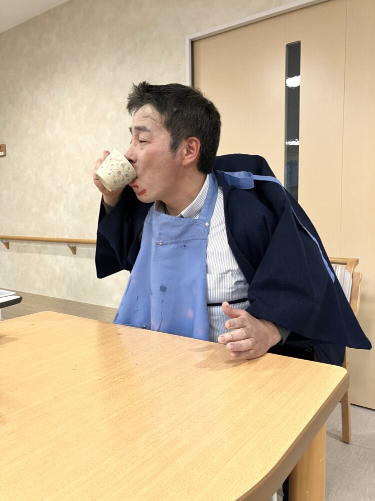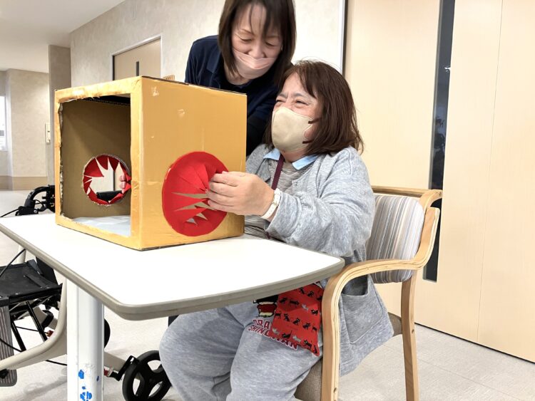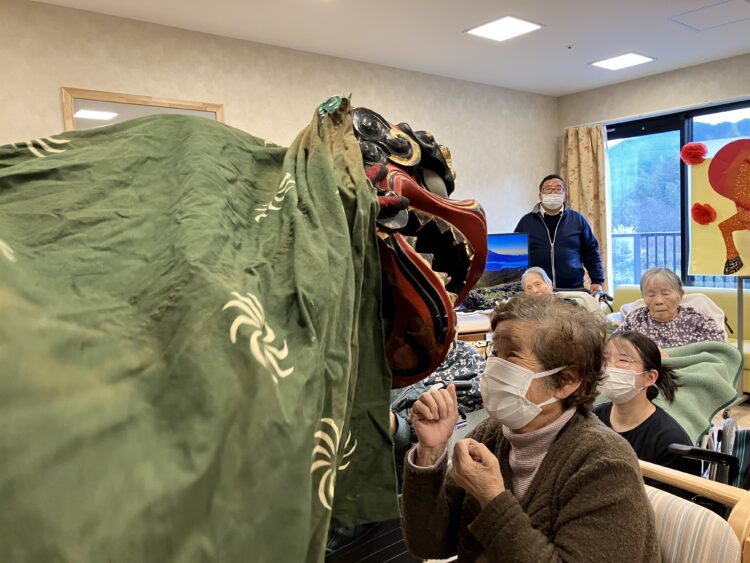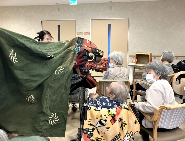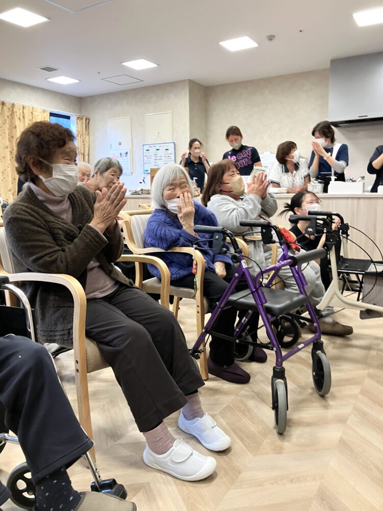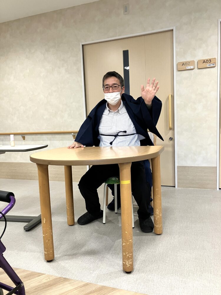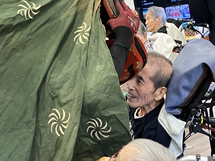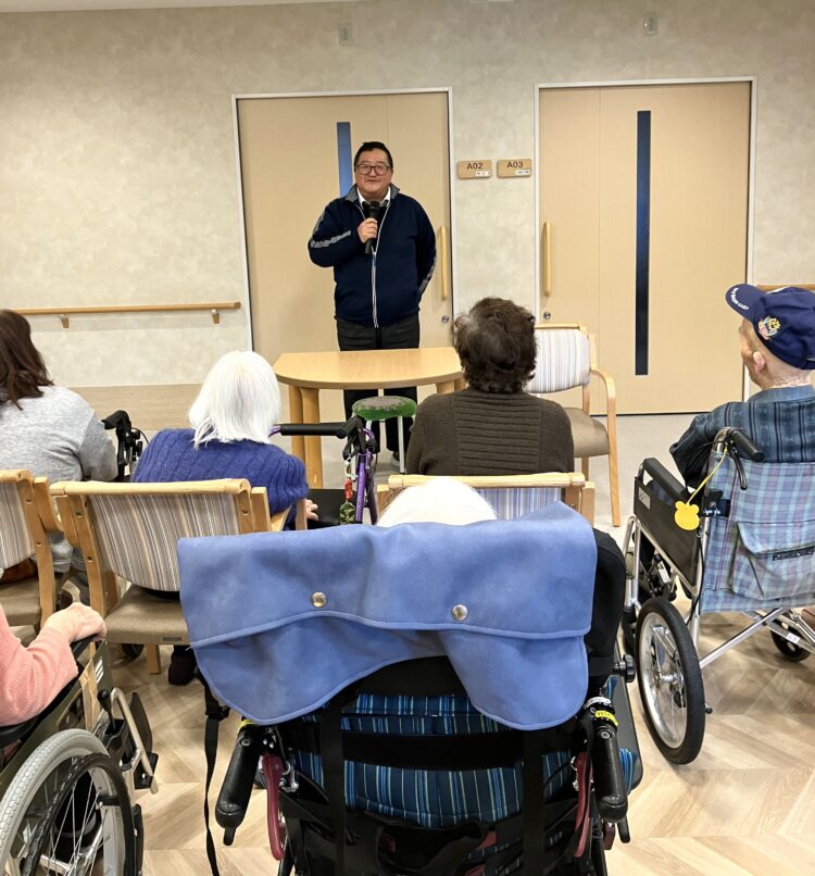 施設長補佐のあいさつを皮切りに、まずは施設長と男性職員による2人羽織りをしました。