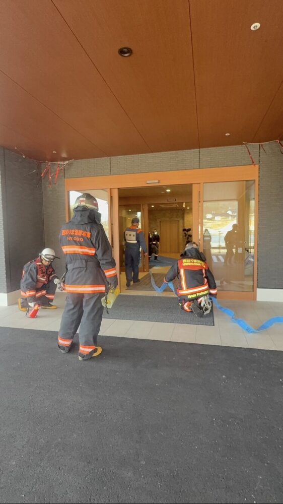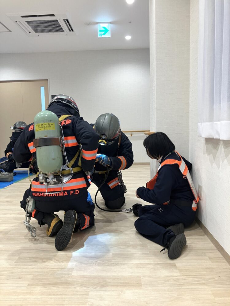 消防隊員は、1階厨房に取り残された職員の救出と消火の訓練を実際の現場同様に行っていただきました。