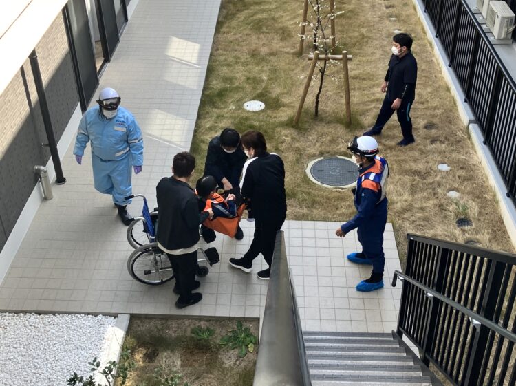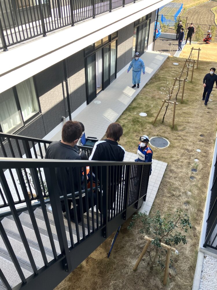 ご利用者役に扮した職員4名を配置し、1名が1階エントランスから避難し、3名が2階非常階段から、レスキューシート44という特別な避難用シートを使用し、3人1組で階段を降りて救助しました。
