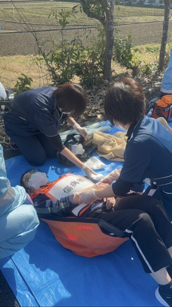 怪我人全員を救出し、避難場所では救急隊員と看護師が応急処置にあたり、訓練は無事終了しました。