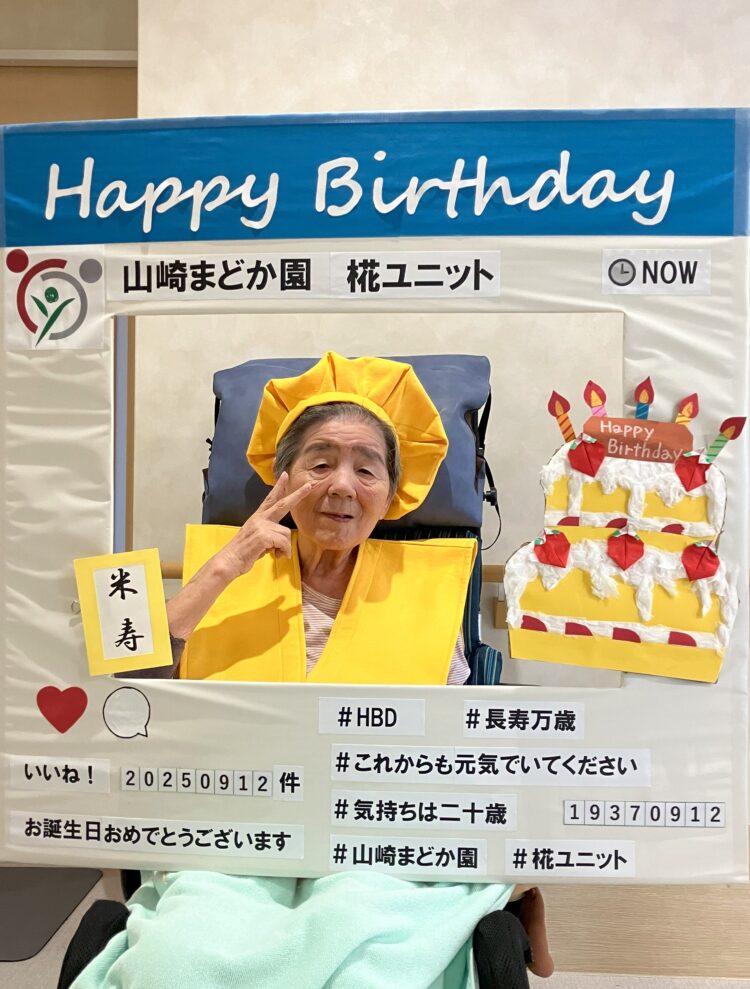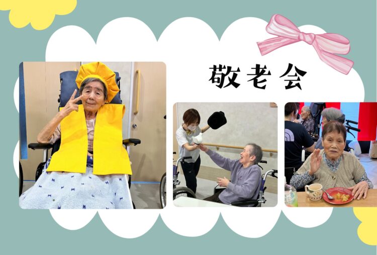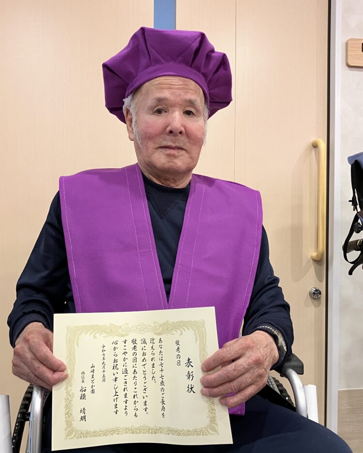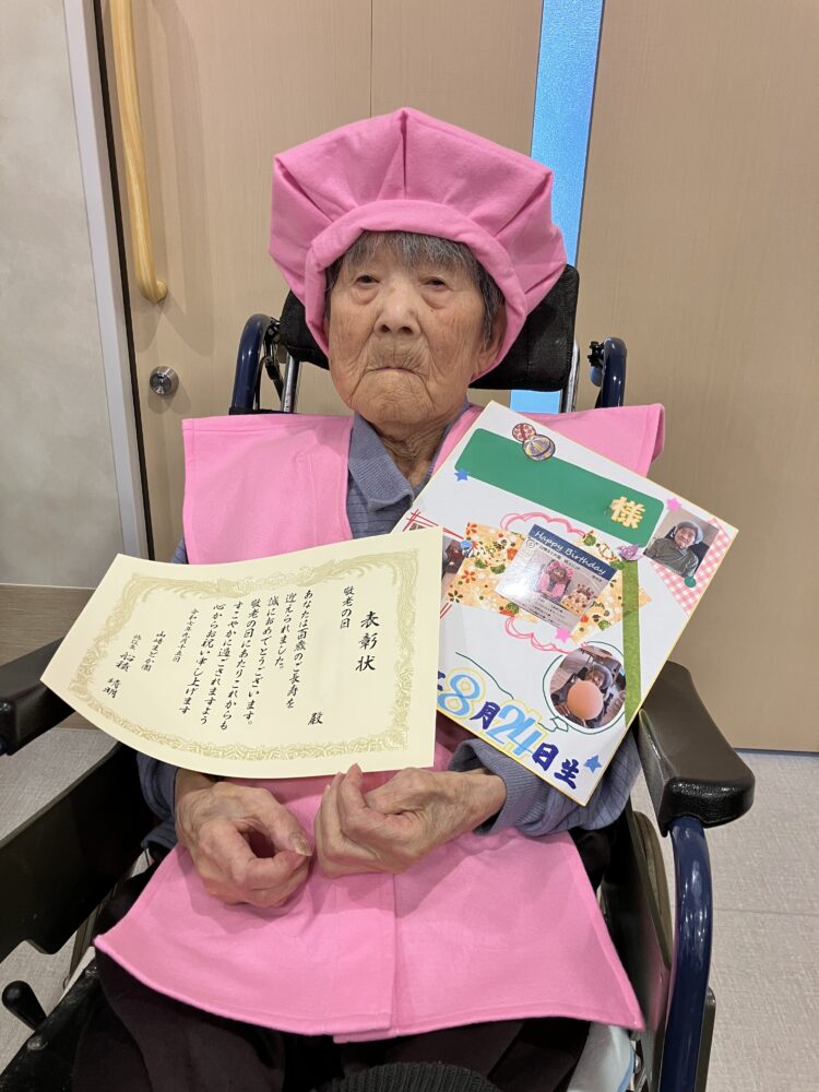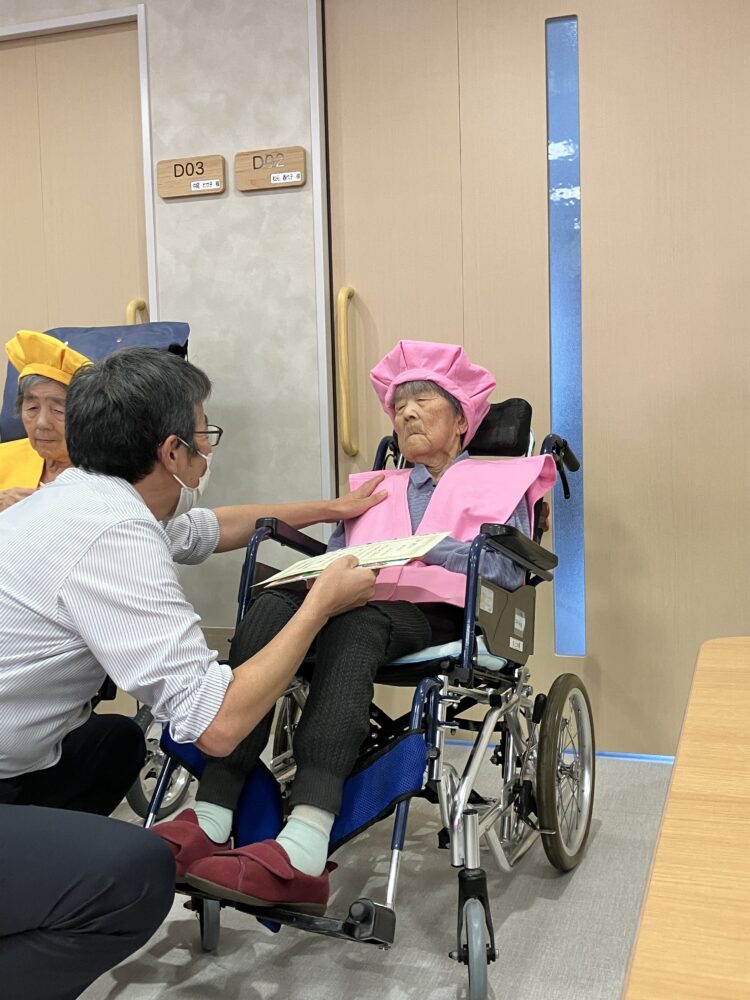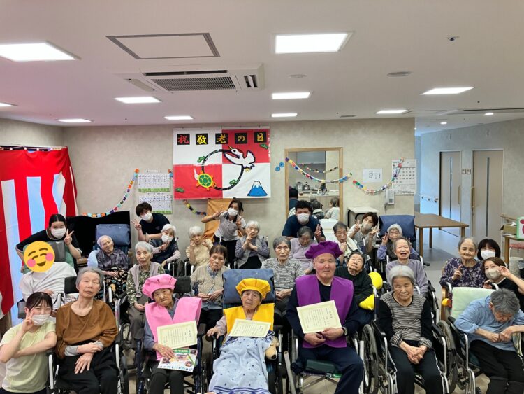 職員手作りのちゃんちゃんこで、喜寿、米寿、百寿のご利用者のお祝いをしました。